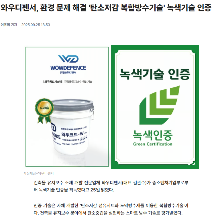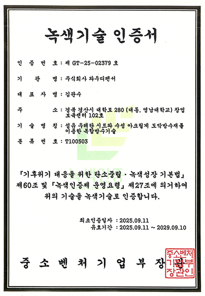 ㈜와우디펜서, 탄소저감을 위한 녹색기술인증 획득!