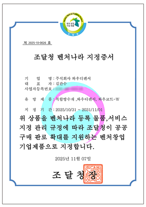㈜와우디펜서는 자사 탄소저감형 방수 제품이 조달청으로부터 '벤처창업기업제품'으로 선정되었습니다.